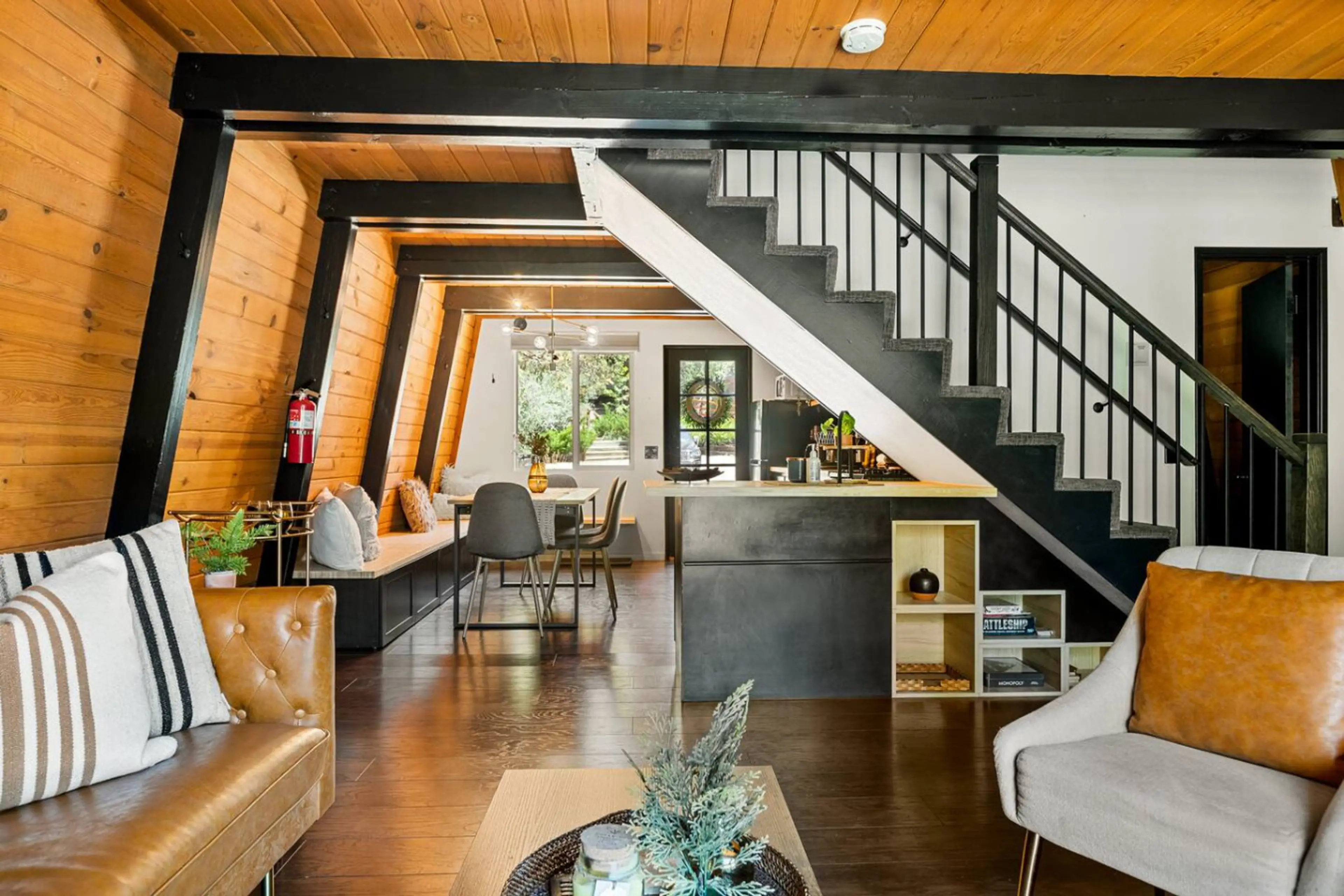 Welcome to Dark Side of the Moonridge — a mid-century modern pine cabin featured in Travel + Leisure; cozy, scenic & ski-ready. Sleeps 5 | 2 bedrooms | 3 beds | 1 baths Private hot tub under the stars (open 10pm–7am) Unobstructed Bear Mountain views Steps to Bear Mtn & Snow Summit (.5–1.1 mi) Wood-...